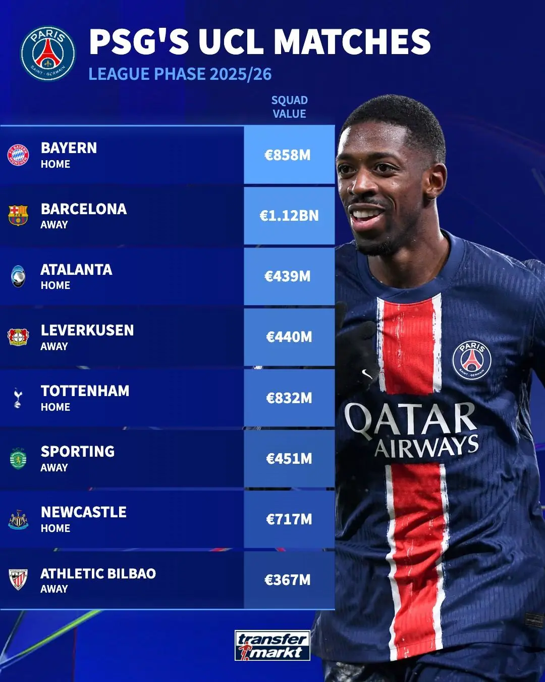 08月29日訊 在本賽季歐冠聯(lián)賽階段抽簽后,德轉(zhuǎn)盤點(diǎn)巴黎圣日爾曼在歐冠聯(lián)賽階段所面對的各支球隊(duì)身價(jià)情況。